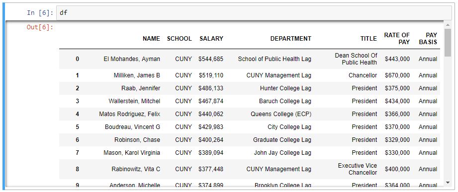 Let’s try to apply everything we’ve learned so far and apply it to a more challenging dataset. For this exercise, you will have to learn a few more Pandas commands on data processing. We will use the CUNY_salaryscrape.txt file that was downloaded earlier.